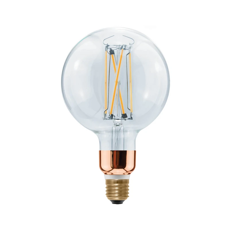 Diese E27-LED-Globelampe aus der High Brightness Serie vereint hohe Lichtleistung und ansprechende Optik. Die gekreuzten LED-Filamente liegen innerhalb eines klaren Glaskolbens, der an der Basis mit einem kupferfarbenen Abschluss versehen ist. Der E27-Sockel aus Metall ist im Goldfinish gehalten.