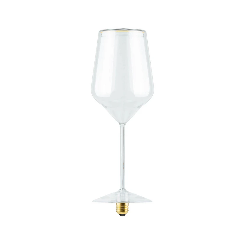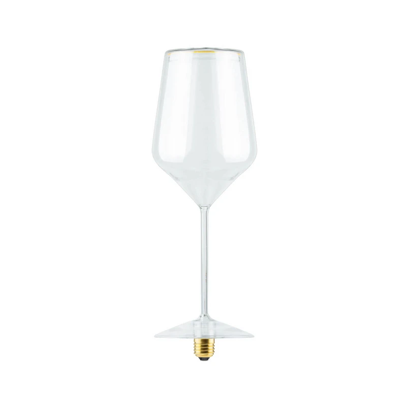 Dieses E27-LED-Leuchtmittel aus der Floating Serie ist mit einem klaren Glaskolben versehen, dessen Form einem Roséweinglas nachempfunden ist. Hinzu kommt ein goldfarbener E27-Sockel aus Metall.