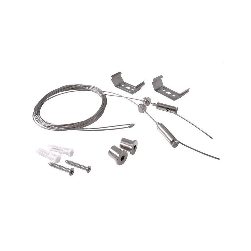 Die Seilabhängung besteht aus Metall und wird im Zweierset geliefert, womit sich eine Leuchte befestigen lässt.