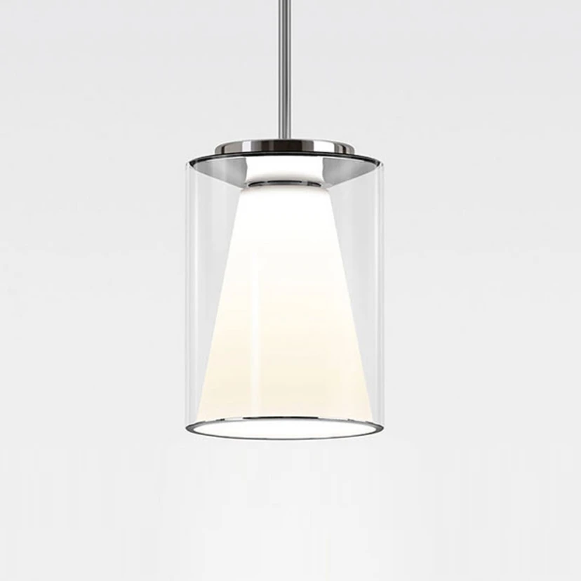 Drum S - LED-Hängeleuchte mit klarem Glasschirm und opalem Innenreflektor - Aufhängung an verchromtem Stahlrohr