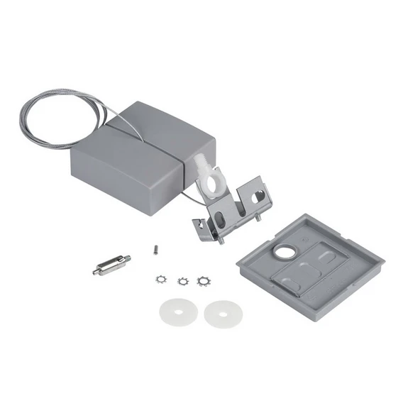 Diese Aufhängung mit verzinktem Stahlseil und rechteckiger Deckenbefestigung dient zur Montage der Büro-Hängeleuchten der Serie Vega.