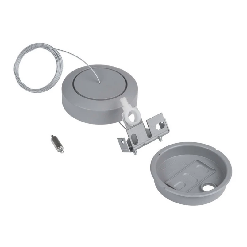Diese Aufhängung mit verzinktem Stahlseil und runder Deckenbefestigung dient zur Montage der Büro-Hängeleuchten der Serie Vega.