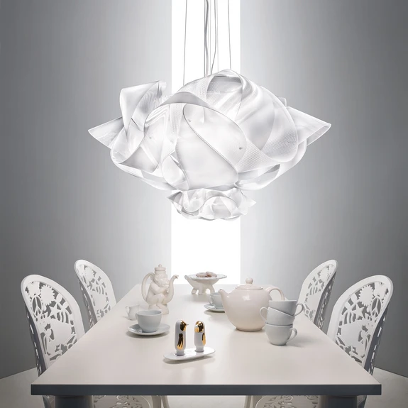 Luftig, leicht und zart wirkt die Designer-Pendelleuchte Fabula aufgrund ihres einzigartigen Designs aus transparentem Kunststoff. Dieser Kunststoff mit dem Namen Lentiflex® wurde vom Leuchtenhersteller Slamp selbst entwickelt und patentiert und zeichnet sich durch seine ganz besondere Wirkung im Zusammenspiel mit Licht aus. Wie zarte Blätter einer Blüte wirken die einzelnen Elemente, aus denen der Schirm dieser einzigartigen Leuchte zusammengesetzt wurde. Dieser wirkt je nach Blickwinkel und Lichteinfall aus jeder Perspektive immer wieder anders. Zwischen den transparenten Elementen aus Kunststoff sitzen unsichtbar fünf E27-Fassungen, die sich mit LED-Lampen bis 12 W bestücken lassen. Um eine optimale Wirkung der Kunststoffelemente des Schirmes zu erzielen, sollten Filamentlampen mit klarem Glas eingesetzt werden.