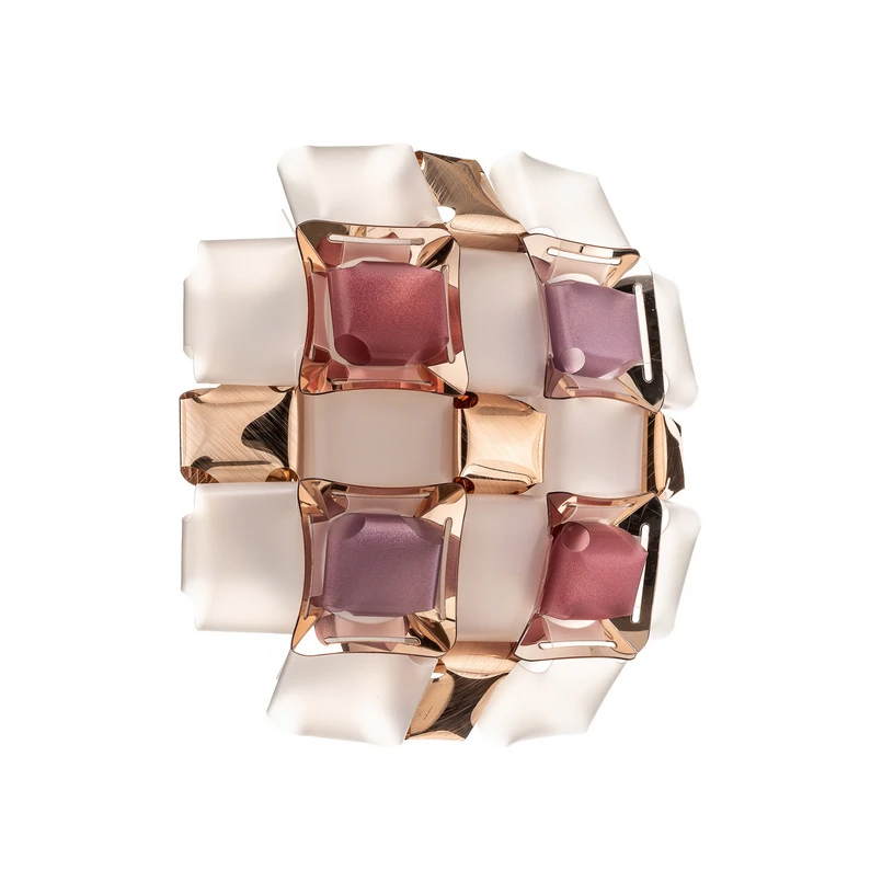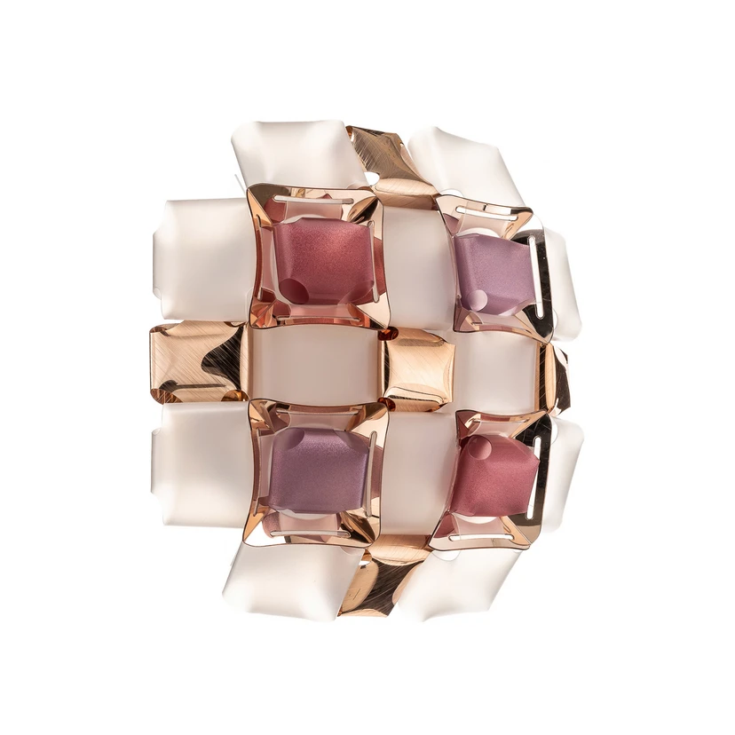 Designer Adriano Rachele ließ sich von der Welt der Edelsteine inspirieren. So erinnert Mida mit ihren gewölbten Elementen an geschliffene Cabochon-Schmucksteine. Neben weißen Abschnitten kommen metallisch glänzende Elemente hinzu, die unterschiedlich gemusterte Oberflächen aufweisen.