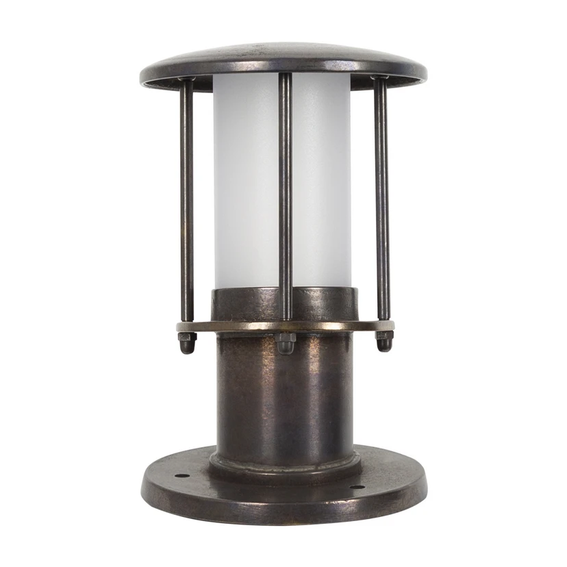 Die Sockelleuchte Resident 3 ist aus hochwertigem Messing gefertigt, das in einem rustikalen Bronzefinish daherkommt. Sie eignet sich beispielsweise perfekt für die Anbringung am Wegesrand im Garten oder auf der Terrasse. Das Gestell der Sockellampe Resident 3 ist zylindrisch geformt und wird von einem Milchglasschirm ergänzt. Dieser wird von dünnen Messingstreben umrahmt. Resident 3 lässt sich sowohl mit Glühlampen als auch mit energiesparenden und langlebigen LED-Lampen bestücken.