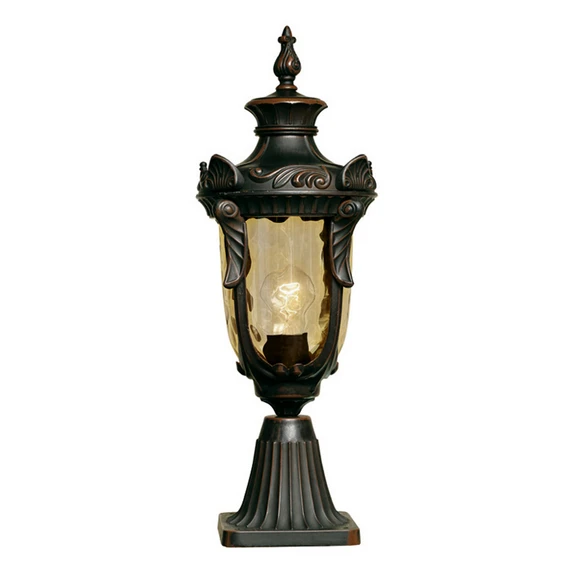 Ein besonderes Flair im eigenen Außenbereich erreicht man mit diesem dekorativen Beleuchtungs- und Gestaltungsobjekt. Die Sockelleuchte ist geprägt von einer antiken Bronze-Optik und steht auf einem imposanten, standfesten Fuß. Zahlreiche Verzierungen und formreiche Details werden ergänzt durch das in Amber eingefärbte Glas, das das Licht gedämpft an die Umgebung abgibt.