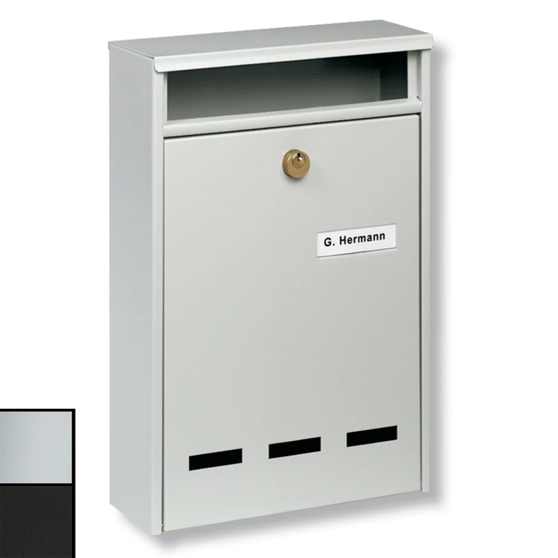 Modell „Wismar“ ist ein Anlagen-Briefkasten, der in geschützten Eingangsbereichen oder Fluren eingesetzt werden kann. Das Hochformat mit Fronteinwurf ermöglicht knickfreies Einwerfen bis DIN B 5. Der Kasten hat keine Einwurfklappe; jedoch Sichtschlitze im unteren Bereich.