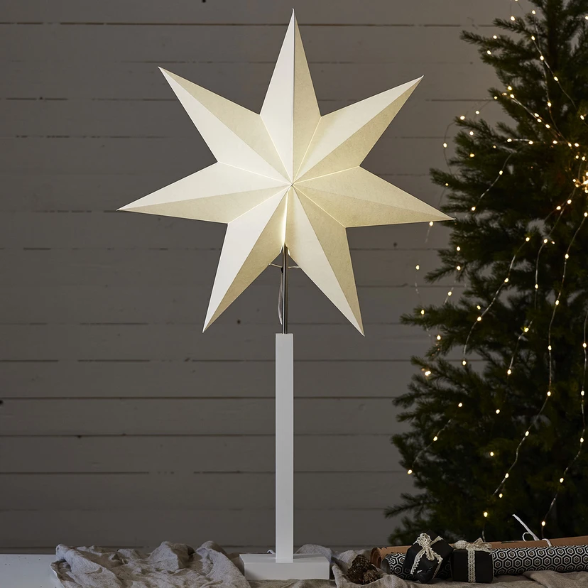 Der siebenzackige Papierstern Karo thront auf einem Gestell aus Metall und ist mit einem rechteckigen Holzfuß bestückt. Karo verbreitet mit seinem sanften Lichtschein eine gemütliche Atmosphäre. Eine schnell platzierte Deko für Kommoden, Tische, Regale und Fensterbänke. In das Gestell ist eine E14-Fassung integriert, in die alle Arten von Leuchtmitteln mit E14-Sockel eingesetzt werden können. Entsprechende Lampen können über Zubehör gekauft werden. Mit Schalter am Kabel ausgestattet.