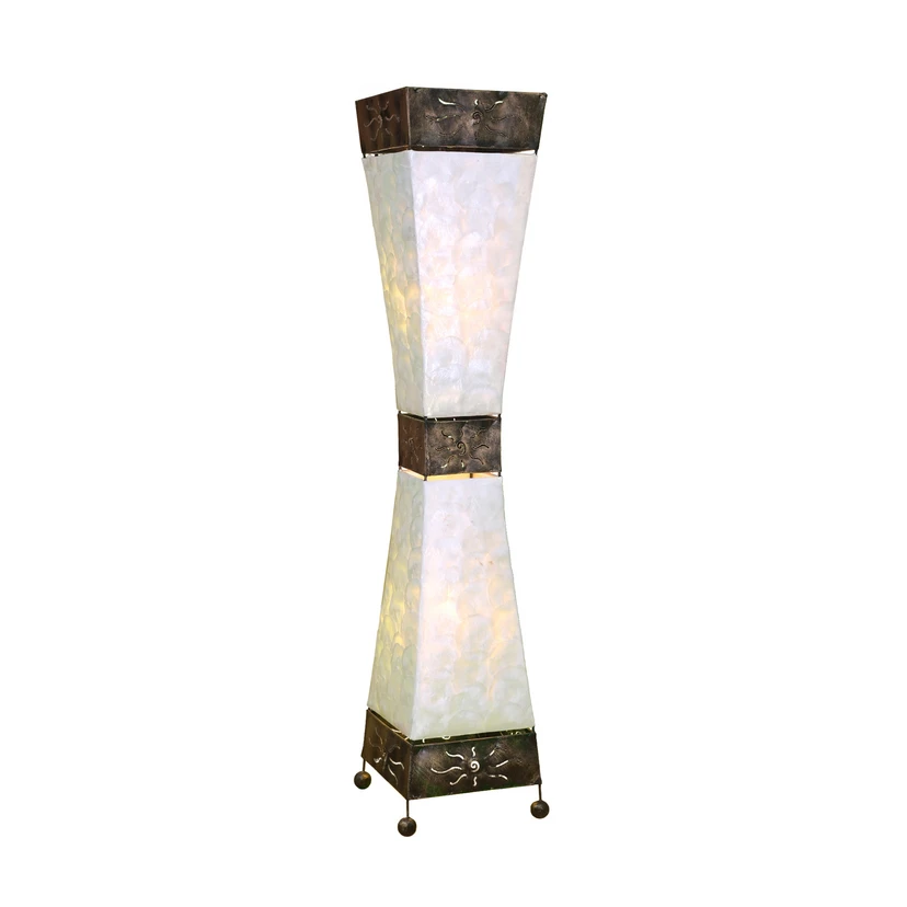 Stehlampe Adrian mit weißen Capiz-Muscheln und drei Abschnitten aus dunklem Metall