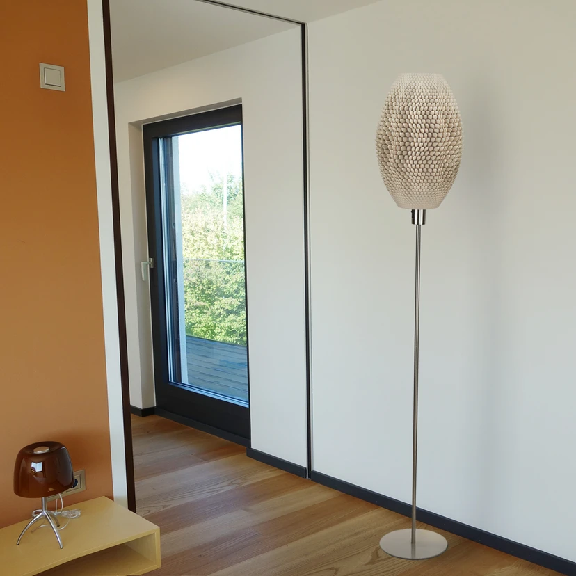 Die deutsche Firma Tagwerk produziert mittels 3D-Druck Leuchten und Lampenschirme aus recycelten Materialien. Sowohl Entwurf als auch Herstellung sind "Made in Germany" und weisen den Weg in die Zukunft der Konsumgüter: Zero Waste, Recyclingmaterialien und eine Produktion ohne Emission und mit Ökostrom. Das verwendete Biomaterial für den Schirm der Stehleuchte wird u. a. aus Abfällen aus der Holzindustrie hergestellt. Das sogenannte Flüssigholz ist leicht, stabil, abwischbar und UV-beständig.