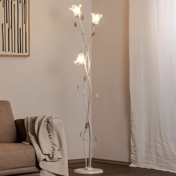 Die Stehleuchte Lancia, gefertigt aus Schmiedeeisen und Glas, verkörpert florentinische Eleganz und zeitlose Handwerkskunst. Mit ihrer elfenbeinfarbenen Oberfläche fügt sie sich harmonisch in verschiedene Wohnräume wie Wohnzimmer und Schlafzimmer ein. Die dreiflammige Konstruktion sorgt für eine gleichmäßige Lichtverteilung und schafft eine angenehme Atmosphäre, die sowohl beruhigend als auch inspirierend wirken kann.