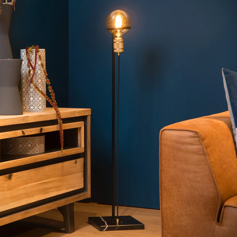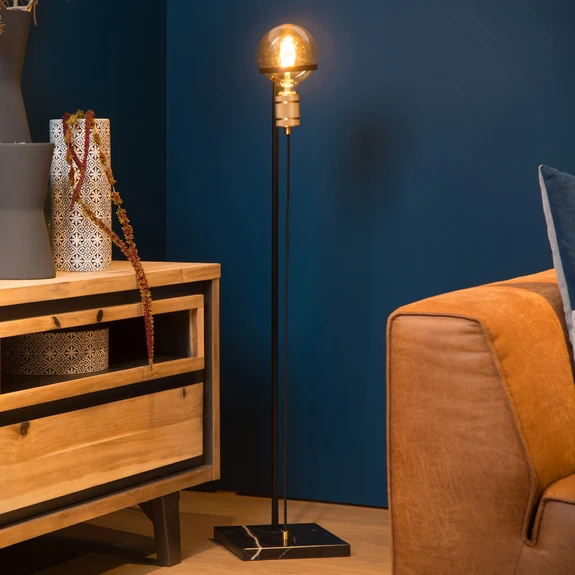 Die Stehleuchte Ottelien besteht aus einer stabilen Stahlplatte, die optisch einer Marmorplatte gleicht. Auf dieser Bodenplatte ist ein Stab montiert, der am oberen Ende eine kreisrunde Halterung hat, die waagerecht in der Luft zu schweben scheint. Diese Halterung hält die Leuchtmittelfassung, die über das Zuleitungskabel mit der Platte verbunden ist, sowie das eingesetzte Leuchtmittel. Sehr ästhetisch wirkt hier ein Globe-Filament-Leuchtmittel, wie es über das Zubehör bestellbar ist. Es wird kein Leuchtmittel mitgeliefert.