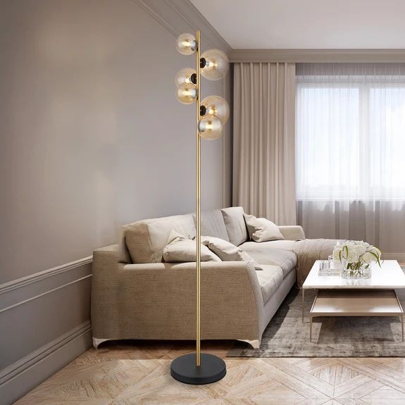 Die Stehleuchte Riha vereint edles Design mit funktionaler Beleuchtung und wird so zum Highlight in jedem Wohnzimmer oder Esszimmer. Gefertigt aus hochwertigem Glas und Metall, besticht sie durch ihre harmonische Farbgebung in Amber, Messing und Schwarz. Diese Kombination verleiht der Leuchte eine zeitlose Eleganz, die sich nahtlos in verschiedene Einrichtungsstile einfügt.