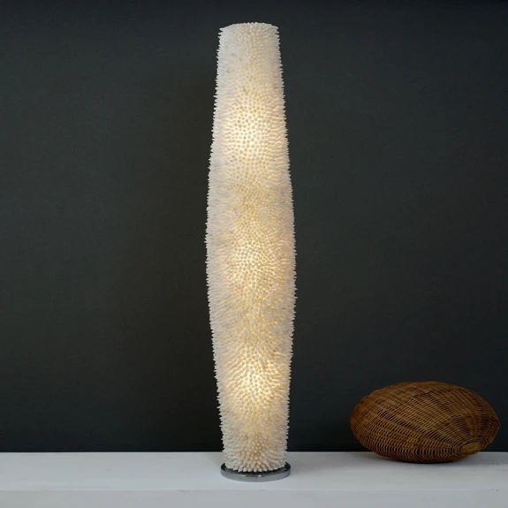 Die zunächst schlichte Form der Leuchte hat ihren besonderen Reiz. Doch bei genauer Betrachtung kommen weitere Highlights hinzu: Die Stehleuchte aus weißem Fiberglas ist mit Muscheln versehen, die in liebevoller Handarbeit aufgesetzt wurden. Drei Leuchtmittel sorgen für ein gemütliches Licht, das jedem Raum ein besonderes Flair verleiht. Ein verchromter Metallfuß sorgt für sicheren Stand.