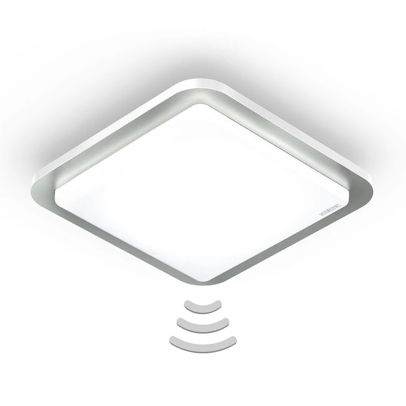 Das Design mit elegantem Metallrahmen und blendfreier Kunststoffabdeckung fügt sich hervorragend in modern gestaltete Innenräume. Der Hochfrequenzsensor erkennt zuverlässig alle Bewegungen in einem Erfassungsbereich von 3 bis 8 m Durchmesser. Die Umgebungshelligkeit, unterhalb der die Leuchte aktiv ist, kann von 2 bis 2.000 Lux festgelegt werden. Die mögliche Leuchtdauer nach Auslösung beträgt 5 s bis 15 min. Daneben ist auch ein dezentes Nachtlicht mit 10% Lichtleistung wählbar.