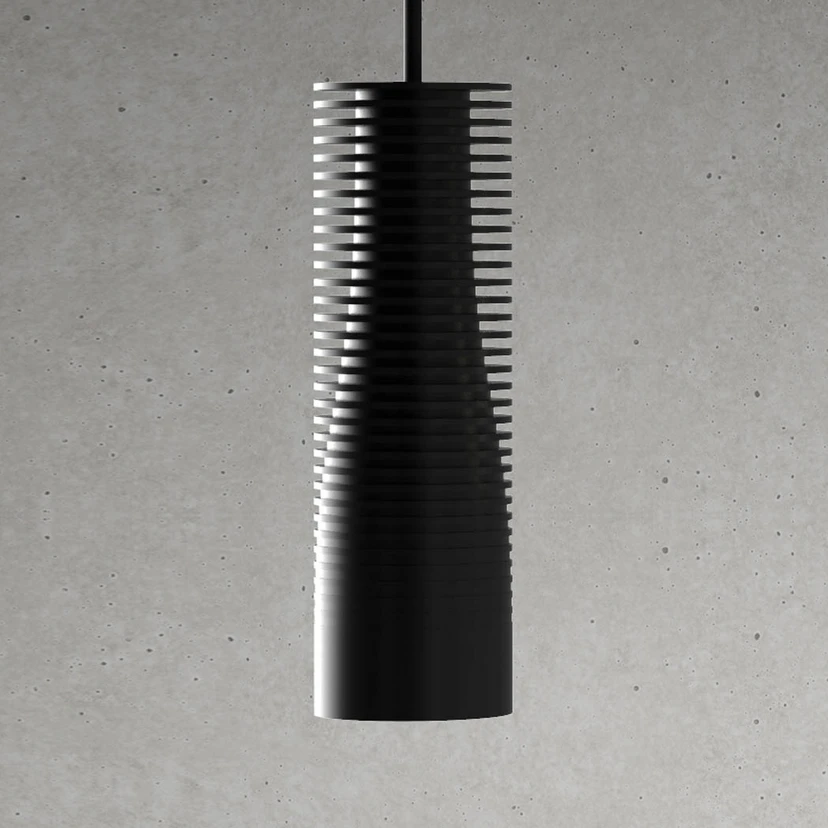Eine moderne, betont funktionale Gestaltung kennzeichnet die LED-Hängeleuchte AircooLED des deutschen Designstudios neunzig° design. Der Korpus ist aus einem einzigen Aluminiumblock gefräst und mit einer farbigen Eloxierung versehen. Der innere Bereich ist im oberen Abschnitt flaschenförmig verjüngt, während Ringe, die zugleich als Kühlrippen dienen, den Durchmesser des unteren Abschnitts beibehalten und so einen Zylinder bilden. Die unten integrierte LED-Lichtquelle liegt rückversetzt im Innern, sodass ihr warmweißes Licht mit guter Farbwiedergabe (CRI > 90) einen Tisch oder Tresen direkt erhellt und zu den Seiten eine Blendwirkung vermieden wird. Bei Bedarf ist das externe Dimmen über den Phasenanschnitt oder Phasenabschnitt möglich.