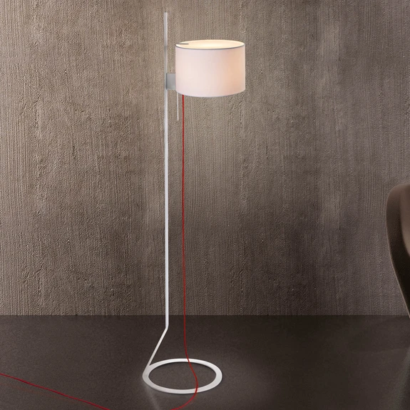 Die vom Designer Michael Raasch entworfene LED-Stehleuchte Loft ist ein wohnlicher und anpassungsfähiger Lichtspender mit modernem Charakter. Das aus Stahl gearbeitete Gestell setzt sich aus einem ringförmigen Fuß und einem schlanken, hohen Stab zusammen. Letzterer hält einen seitlich angebrachten Zylinderschirm aus Textil. Dieser ist magnetisch befestigt und kann in beliebiger Höhe und Neigung am Gestell positioniert werden. Das warmweiße Licht mit guter Farbwiedergabe (CRI > 90) wird sanft in den Raum abgegeben und lässt sich über den Dimmschalter auf dem Steckerkabel zusätzlich regeln.