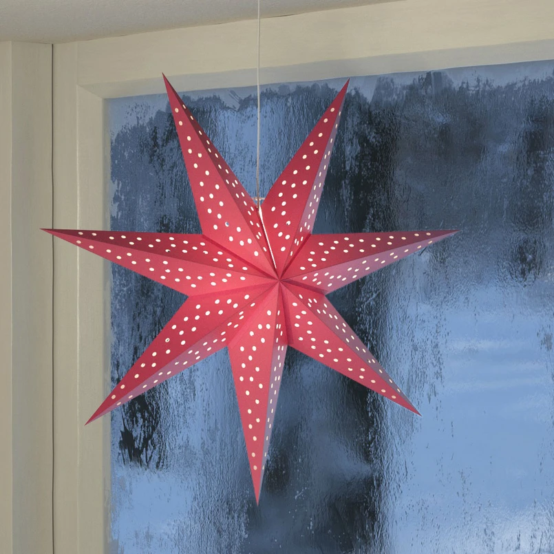 Dieser große Stern wird an jedem Ort in der Wohnung zum absoluten Hingucker und das nicht nur in der Weihnachtszeit. Der Stern aus Papier, das mit einem Lochmuster versehen wurde, eignet sich ideal als Fensterdekoration, wirkt aber auch an jedem anderen Platz sehr auffallend, vor allem dann, wenn die Beleuchtung eingeschaltet wird und den Stern perfekt in Szene setzt.
