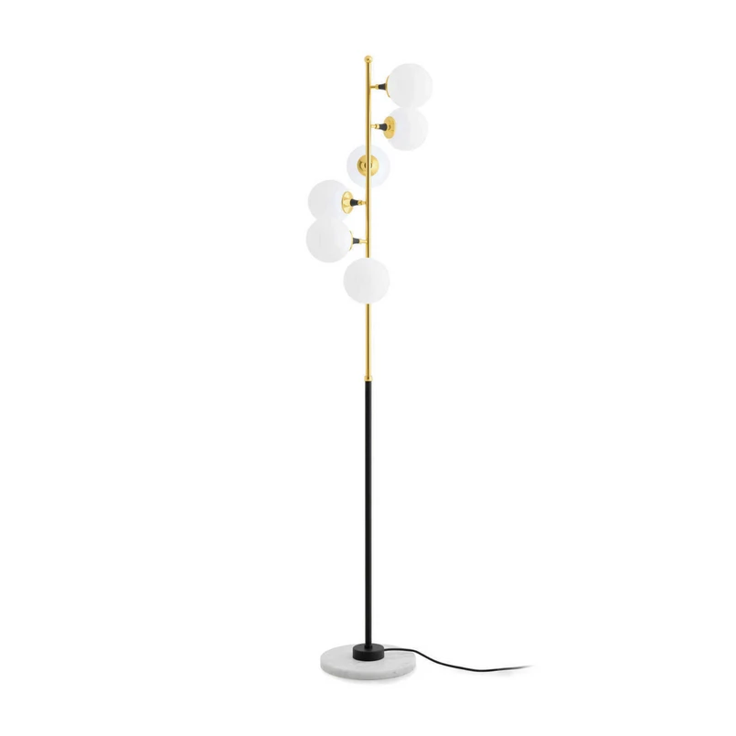 Die LED-Stehleuchte Galassia mit der fesselnden Bewegung von sechs weißen Triplex-Glaslichtquellen bereichert den Raum mit einem raffinierten Retro-Touch, der den Charme der 1950er Jahre bewahrt. Der Sockel aus weißem Carrara-Marmor verschönert diese einzigartige Leuchte. Die sechs der Lieferung beiliegenden und warmweiß strahlenden E27-Leuchtmittel sind austauschbar. Mit Fußschalter und 3,5 Meter langer Steckerzuleitung.