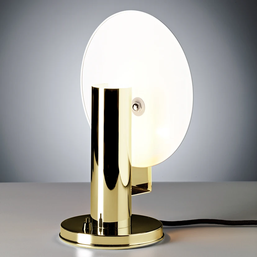 Diese Tischleuchte wurde 1930 ursprünglich in den Niederlanden zu Zeiten der De-Stijl-Richtung gestaltet; der genaue Schöpfer ist nicht bekannt. Nun wurde das Design neu aufgelegt. Vorherrschende Grundsätze der Kunstform sind puristische, geometrisch-abstrakte Formen, die an das deutsche Bauhaus erinnern. Die Tischleuchte hat einen weißen Lampenschirm, der auf dem wahlweise in poliertem Messing oder verchromtem Metall erhältlichen Sockel nach Belieben positionierbar ist. Die niederländische Künstlergruppierung De Stijl fand sich 1917 zusammen und bevorzugte eine schlicht gehaltene Darstellung in Kunst und Architektur.