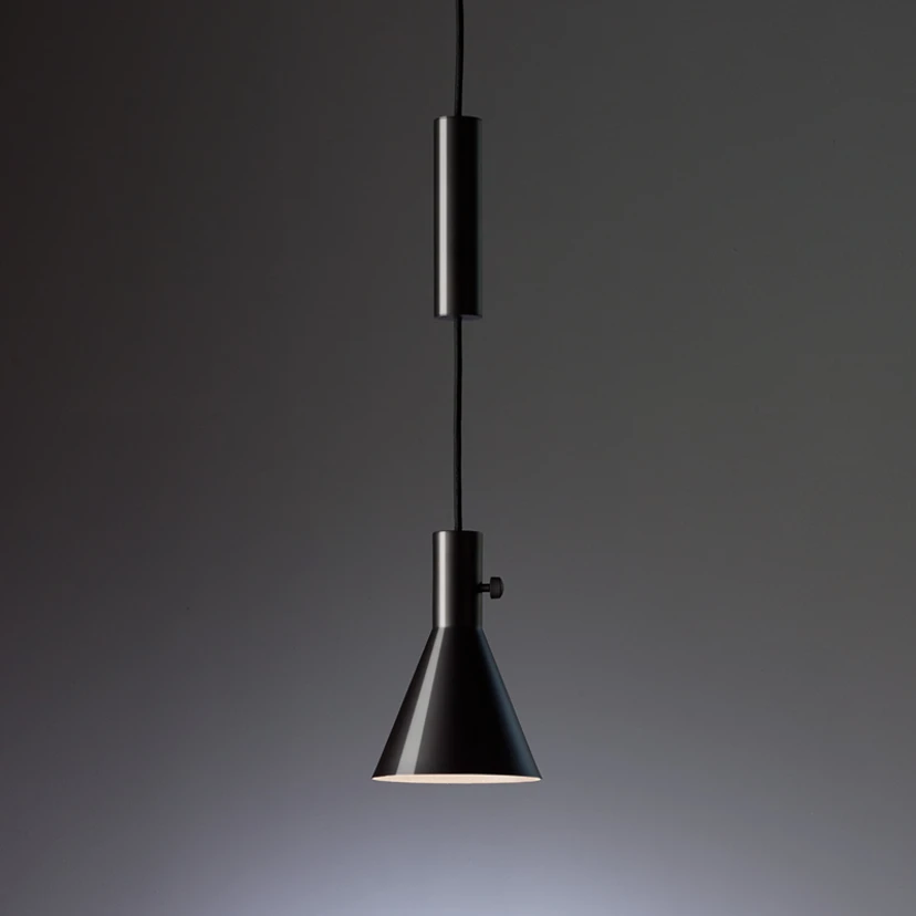 Eleu besitzt eine klare Formensprache und mit der glänzend schwarzen Oberfläche eine zeitlose Tönung. Genau genommen ist die Optik der Hängelampe dreigeteilt, denn neben der Deckenhalterung und dem Schirm, die über eine Abhängung miteinander verbunden sind, befindet sich noch ein im selben Design gehaltenes Element etwa mittig in der Abhängung.