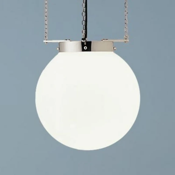 Dieses Modell ist eine Variation der von der Künstlerin Marianne Brandt erdachten Deckenleuchte von 1926, als sie am Bauhaus tätig war. Dem kugelförmigen Lampenschirm aus weißem Opalglas dienen drei jeweils 100 Zentimeter lange Ketten als Aufhängung, die an einem Baldachin aus wahlweise Messing oder Nickel befestigt sind. Die Hängeleuchte gibt es in acht verschiedenen Größen und Ausführungen. In dieser Hängeleuchte verschmilzt die präzise Wiederentdeckung eines Klassikers mit einem neuen, individuellen Element.