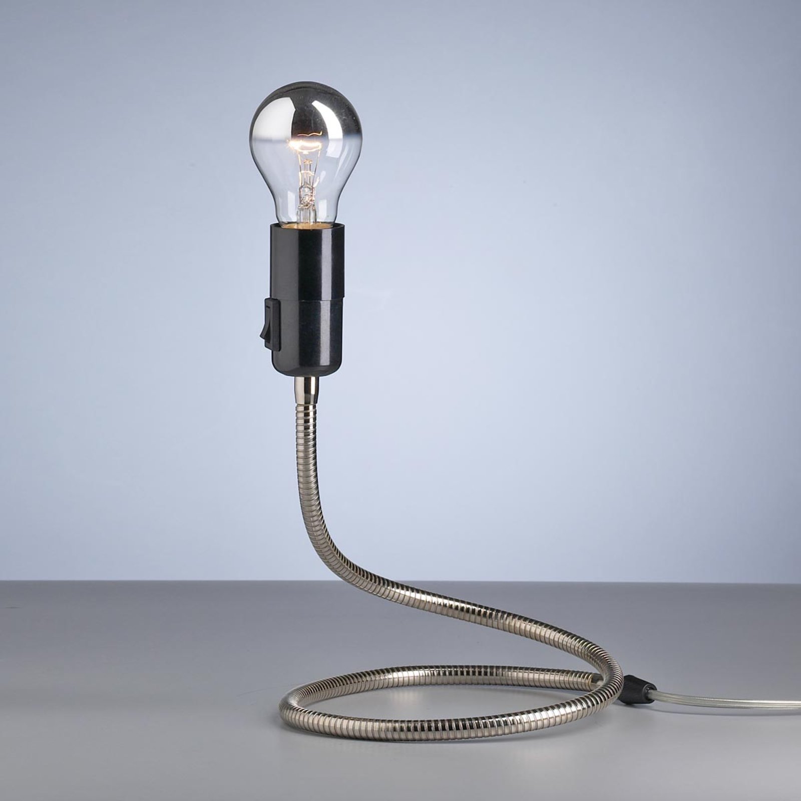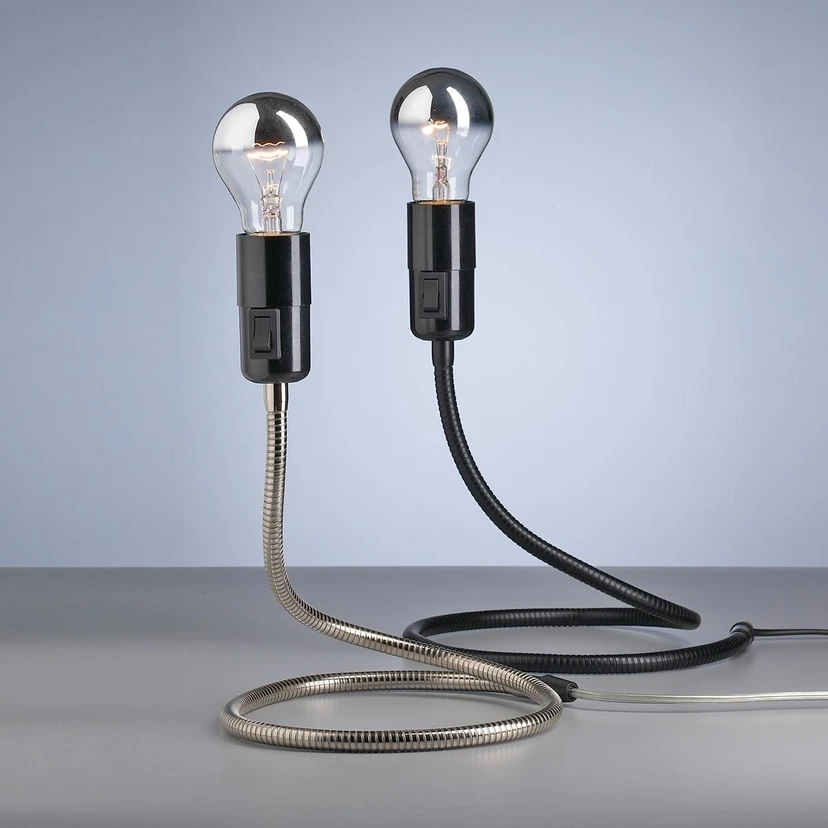 Diese von Walter Schnepel, einem der aktivsten Designer der Firma TECNOLUMEN, entworfene LED-Tischleuchte zeigt sich als Mischung aus funktionalem Charakter - ausgedrückt durch das sichtbare Leuchtmittel und den flexiblen Metallschlauch - und Kreativität. An die stets schwarze Fassung schließt sich ein ebenfalls schwarzer oder vernickelter Metallschlauch an.