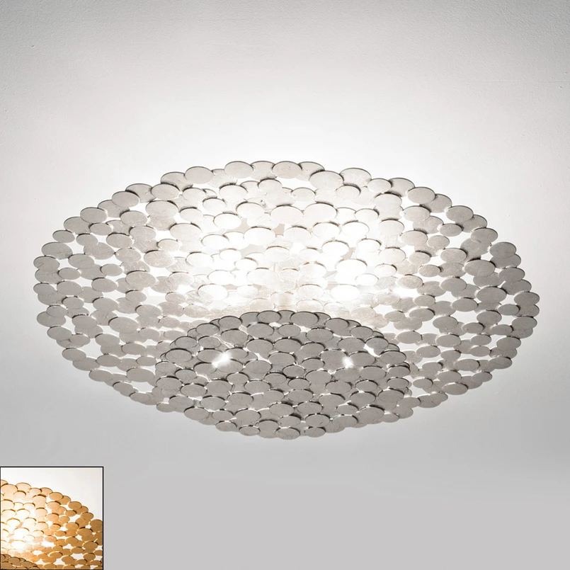 Die ansprechende runde Form der Deckenleuchte Tresor wird durch eine Anzahl von Metallscheiben kreiert, die unterschiedliche Größen besitzen und somit eine Art Kugel formen. Da jede dieser Platten per Handarbeit gelötet wurde, entstehen Unikate, die über eine hochwertige Qualität verfügen. Sobald das Leuchtmittel im Inneren eingeschaltet wird, entsteht ein unglaublich schönes Lichtbild, das sowohl im privaten Bereich als auch in Restaurants oder Hotels eingesetzt werden kann.