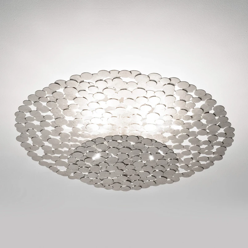 Dieses Schmuckstück besteht aus zahlreichen unterschiedlich großen Metallscheiben, die der Deckenleuchte ihre runde Form geben. Jede einzelne von ihnen wurde von Hand verlötet. Beleuchtet wird die Wandleuchte zum faszinierenden Lichtobjekt. Eine ausdrucksstarke Bereicherung für Wohnräume - aber auch für Restaurants oder Hotelfoyers.
