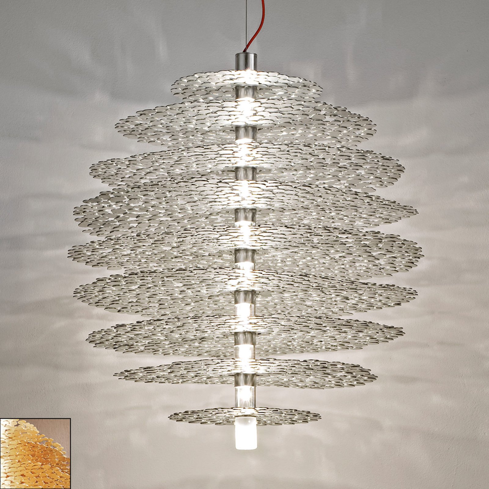 Eine herrliche Impression in Silber oder Gold verschafft die Hängeleuchte Tresor vom Designer Jean-François Crochet. Kleine Metall-Pailletten sind eng miteinander verlötet und zu Metallscheiben geformt. Sie liegen rund um eine Leuchtmittelröhre wie um eine Achse. Die unterschiedlich großen Scheiben lassen eine licht- und luftdurchlässige Skulptur im Raum erstehen. Beginnt das Leuchtmittel Licht abzustrahlen, werden auf den unebenen Scheiben unzählige Lichtreflexe erzeugt und bilden ein Gesamtkunstwerk aus Licht. Die faszinierende Designer-Leuchte ist ein Prachtstück für Empfangssäle oder das hochwertige Wohninventar.