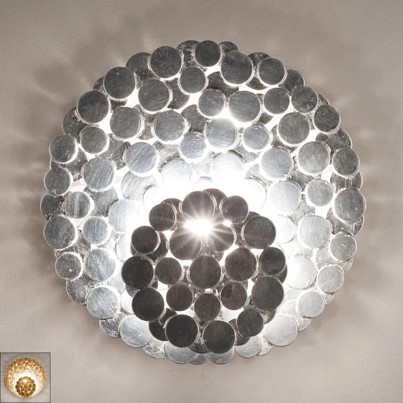 Eine exklusive Impression in Gold oder Silber entsteht durch Wandleuchte Tresor nach Designer-Entwurf von Jean-François Crochet. Feine Metall-Pailletten sind sowohl bei der Wandhalterung als auch für die davor liegende Blende verlötet worden und zu runden Metallscheiben geformt. Zwischen Wandhalterung und Blende liegt das Leuchtmittel. Es strahlt das Licht gegen die Metall-Halterung und erzeugt darauf herrliche Lichtreflexe. Bei Draufblick bleibt das Leuchtmittel verborgen. Die edle Designer-Leuchte eignet sich als hochwertiges Leuchtenaccessoire im stilvollen Ambiente.