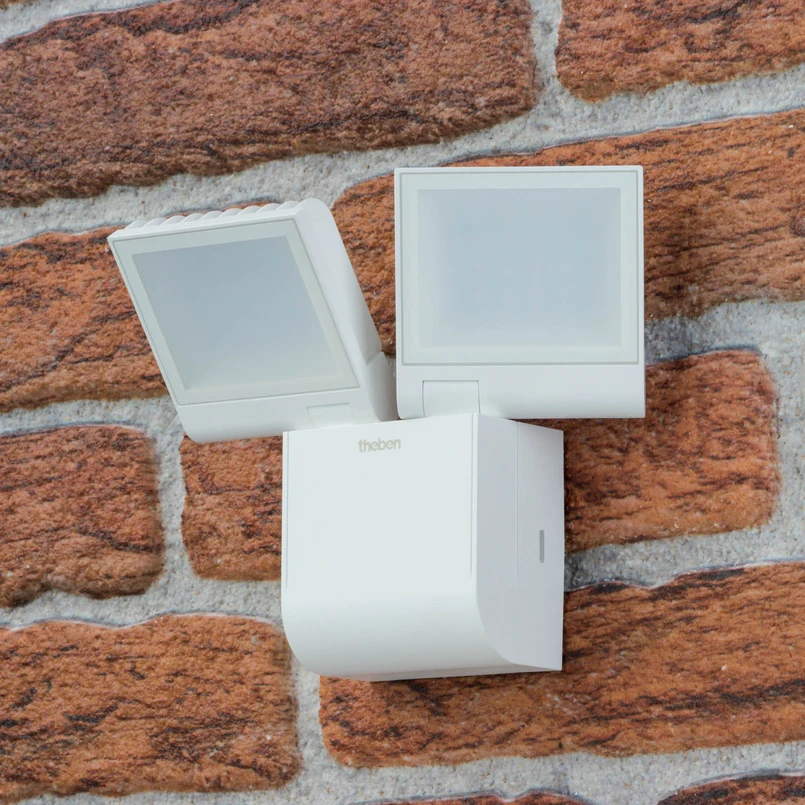 Quasi "um die Ecke gedacht" hat Theben mit dem LED-Strahler theLeda S17-100L WH für die Wandmontage. Gleich zwei horizontal um ± 21/45° drehbare und um 70° nach unten schwenkbare LED-Panels machen auch die Ausleuchtung etwas komplexerer Flächen (Hofeinfahrt, Eingangsbereich, Garageneinfahrt, Carport, etc.) im Außenbereich zum Kinderspiel.