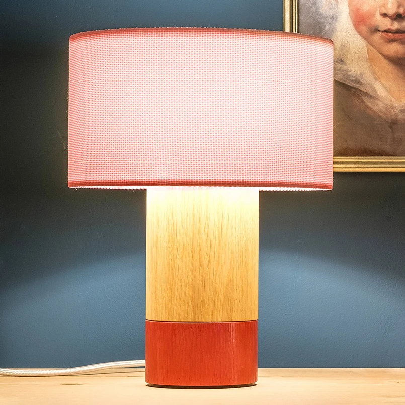 Klippas Formgebung beschränkt sich auf unterschiedlich breite, stehende Zylinder und wirkt dadurch klar und aufgeräumt. Die farbliche Gestaltung der Tischleuchte steht dazu in deutlichem Kontrast. Zu dem Fuß aus hellem Eichenholz gesellen sich ein korallenroter Sockel sowie ein Chintz-Schirm in Puderrosa. Mit dieser mutigen Farbkombination fällt Klippa sofort ins Auge. Ein in das Kabel integrierter Handdimmer ermöglicht die Anpassung der Lichtleistung.