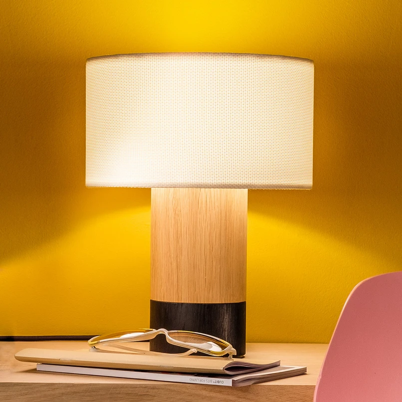 Der klassische Textilschirm ist vertikal geöffnet und sorgt über die Lichtemission in Richtung Decke und Tisch für Grundbeleuchtung. Auch der Fuß aus Eichenholz greift das Zylindermotiv auf. Dieser weist überwiegend eine naturbelassene Oberfläche auf; nur am Sockel wird ein farblicher Kontrapunkt gesetzt.