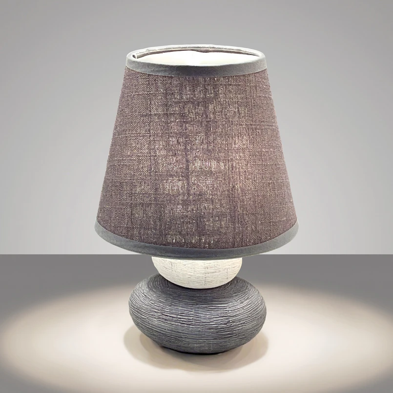 Tischleuchte Bella mit einem natürlich gestaltetem Keramikfuß und einem Schirm aus Leinen