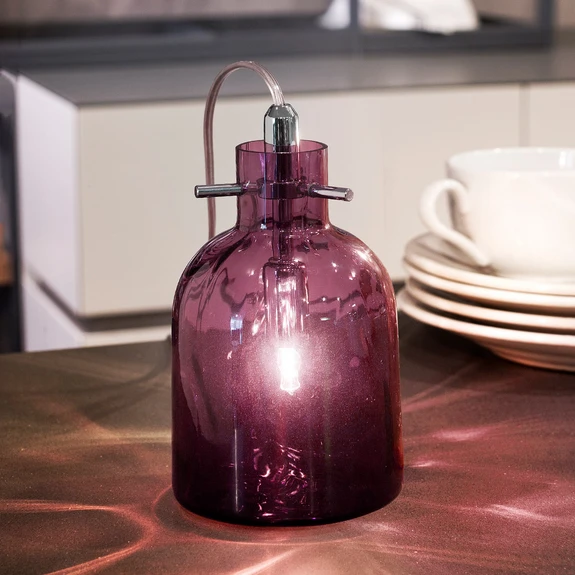 Der Schirm der Tischleuchte Bossa Nova ist in gedrungener Flaschenform aus mundgeblasenem Glas gearbeitet. Das Glas wirkt nicht nur durch die leichte Färbung ganz besonders, sondern auch durch die leicht wellige Struktur. Beides verleiht dem abstrahlenden Licht eine weiche Zeichnung und bewirkt an dem Platz, an dem sie aufgestellt wird, fabelhafte Lichtakzente.