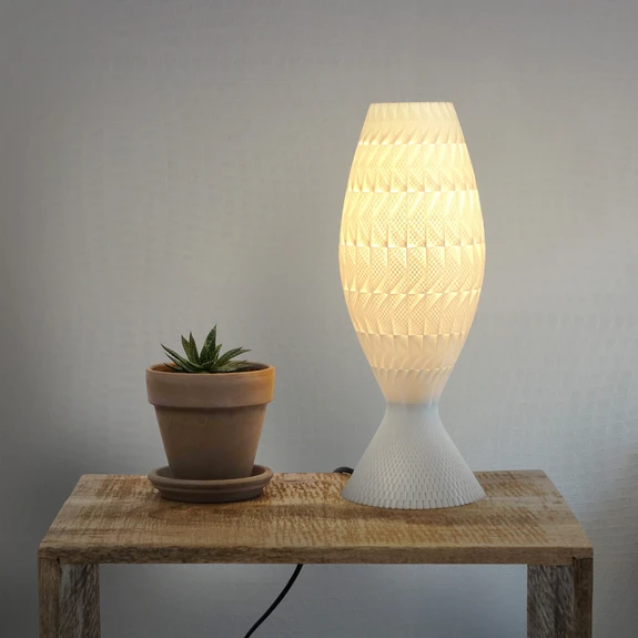 Tischlampe Fraktal aus dem 3D-Drucker - hergestellt aus recycelten Holzabfällen