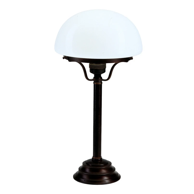 Die Tischleuchte Frank überzeugt mit ihrem auffallenden Glasschirm, der nahezu eine Halbkugel ist und den Kopf der Leuchte bildet. Die aufwändige Herstellung des Schirms ist dabei ein Herausstellungsmerkmal, denn er wurde mundgeblasen. Gehalten wird er, durch den schlichten aber dennoch hochwertigen Anblick der Halterung. Der Kontrast durch die dunkle Antikfarbe des Fußes und das weiße Glas des Schirms heben diese Leuchte hervor. Ein besonderes Merkmal stellt die Oberflächenbehandlung dar, welche sehr stark an das der originalen Antikleuchten erinnert und durch das Abwischen mit Olivenöl sogar zu einem dezenten Glänzen führt.