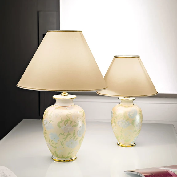 Die Tischleuchte Giardino Perla besticht mit einem bauchigen Keramikfuß, der mit zarten Blumenranken und einem dünnen, goldenen Rand verziert ist. Oben auf thront ein cremefarbener Textilschirm in klassischer Form. Der Schirm ist ebenfalls mit 24 Karat Goldrändern versehen und verleiht der Leuchte einen edlen Touch. Das Textil filtert das Licht angenehm und leitet es in wohliger Art in den Raum. Mit Giardino Perla entsteht ein warmes Lichtklima im gemütlich eingerichteten Wohnbereich sowie im Hotelambiente.