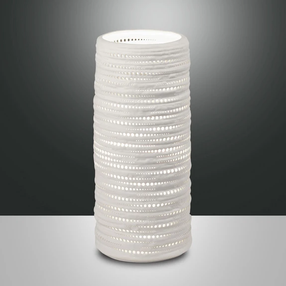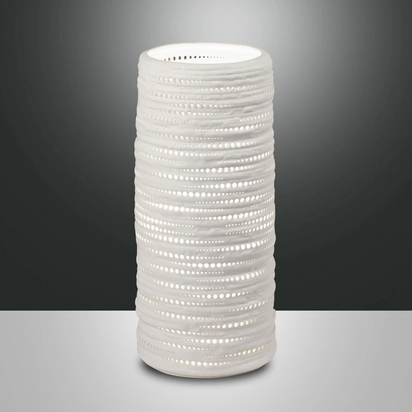 Zahlreiche runde Löcher, die in horizontalen Streifen angeordnet sind, zieren den gesamten zylindrischen Korpus der Tischleuchte Marbella. Im Innern kann eine E27-Lampe eingesetzt werden, deren Licht nicht nur durch die obere Öffnung, sondern zudem ringsum durch die kleinen Löcher austritt und so den Raum mit einem stimmungsvollen Spiel aus Lichtpunkten verzaubert. Damit wird dieses aus weißer Keramik gefertigte Accessoire zur idealen dekorativen Bereicherung für Kommode oder Fensterbank.