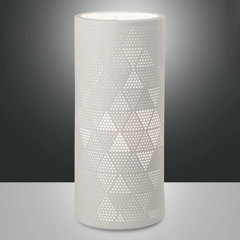 Der zylindrische, oben offene Korpus der Tischleuchte Micol besteht aus weißer Keramik. Er ist durchgängig von kleinen, runden Löchern durchzogen, die in dreieckigen Abschnitten zusammengefasst sind. Im Zusammenspiel mit der einzusetzenden E27-Lampe entstehen effektvolle Lichtmuster an den Wänden und dem umgebenden Interieur. Auf der Fensterbank oder dem Sideboard findet Micol als dekorative Zusatz-Lichtquelle ihren geeigneten Platz.