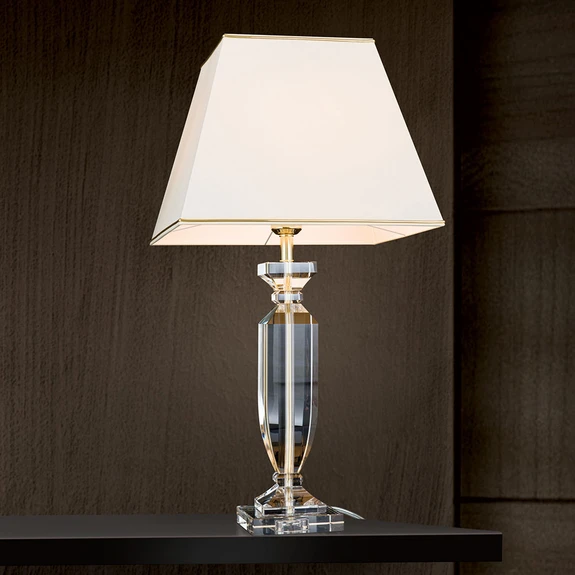 Pokal präsentiert sich als edles Accessoire eines gehobenen Einrichtungsdesigns und spendet in Wohn- und Schlafräumen eine sehr behagliche Zusatzbeleuchtung. Auch unbeleuchtet zieht sie aufgrund ihrer exklusiven Machart alle Blicke auf sich. Der Fuß der Tischleuchte Pokal besteht aus einem goldfarben lackierten Stahlstab, auf dem ein eckiger, cremefarbener Stoffschirm mit goldfarbener Borte am unteren Rand thront. Der dünne Metallstab ist komplett in transparenten K9-Kristall eingehüllt. Der Schalter, das Kabel und der Stecker sind ebenfalls transparent gearbeitet. Es entsteht ein filigraner Gesamteindruck, der die Exklusivität von Pokal noch unterstreicht.