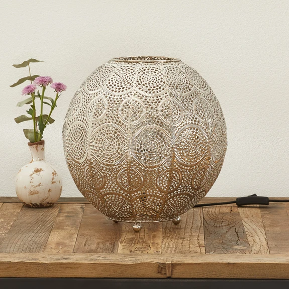 Die orientalisch geprägte Tischleuchte Stampa präsentiert sich in Form einer Kugel mit dezenten, runden Füßen und sieht durch das polierte Nickel sehr edel aus. Mit filigranem Stil wurde ein ansprechendes Lochmuster in den runden Metallschirm eingearbeitet, das lichtdurchlässig ist. Viele runde Formen zieren die Oberfläche dieser Leuchte und sorgen bei Lichtaustritt für bezaubernde Effekte im Raum. Wer sich ein Stück Orient in die eigenen vier Wände holen möchte ist mit dieser edlen Leuchte gut beraten.