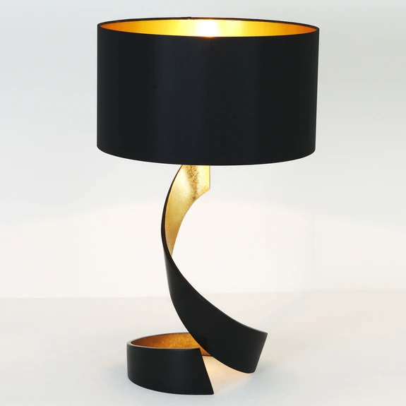 Textil-Tischleuchte Vortice mit dekorativ geschlängelten Eisenfuß Vortice zieht alle Blicke auf sich: Ihr Fuß besteht aus einem Eisenband in Schwarz und Gold, das sich in die Höhe schlängelt. Darauf thront ein Stoffschirm aus Chintz. Die Außenseite des Schirms ist schwarz. Das goldfarbene Schirminnere verleiht dem abstrahlenden Licht des eingesetzten Leuchtmittels (E27, nicht enthalten) eine fast magische Wirkung. Das Zuleitungskabel ist schwarz und mit einem Schalter ausgestattet, über den sich die Beleuchtung bequem ein- und ausschalten lässt.