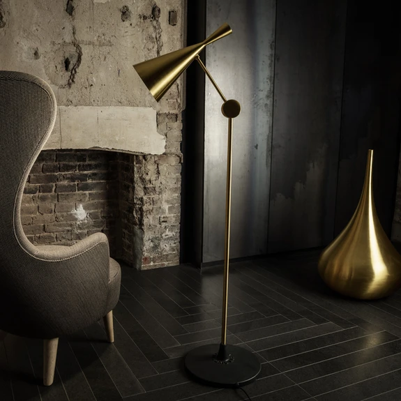 Diese Stehleuchte mit ihrer geradlinigen, klaren und zugleich eigenständigen Formensprache und der hochwertigen Ausführung ist eine weitere Variation der berühmten originalen Beat-Leuchten. Neben dem stabilen, gusseisernen Sockel verfügt sie über ein schlankes Gestell und einen trichterförmigen Schirm aus Messing, der das Licht nur gezielt durch die runde Öffnung nach schräg unten abgibt. Der Schirm ist an einem Gelenkarm angebracht, der eine Justierung der vertikalen Ausrichtung ermöglicht. Die messingfarbene Innenseite verleiht dem Licht einen sehr warmen Charakter. Diese außergewöhnliche Stehlampe eignet sich sowohl für den privaten als auch öffentlichen Bereich und ist in jedem Interieur ein Hingucker.