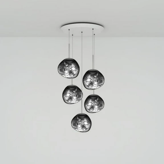 Ein spezielles, hoch technisiertes Produktionsverfahren sorgt bei der fünfflammigen Hängelampe Melt Mini Round für eine optische Täuschung. Die Schirme von Melt Mini Round sehen aus, als wären sie aus geschmolzenem Glas gearbeitet. Dabei handelt es sich bei dem Schirmmaterial um Polycarbonat, einen Kunststoff, der so bearbeitet wurde, dass ein beeindruckender Schmelzeffekt entsteht, wenn das LED-Licht eingeschaltet ist.