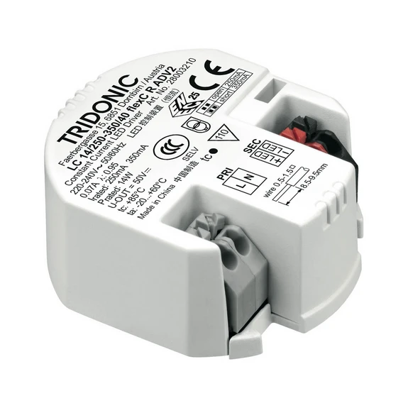 Runder Konstantstrom-LED-Treiber LC flexC R ADV2 IP20 von TRIDONIC zum Leuchteneinbau, Ausgangsstrom in zwei Stufen wählbar