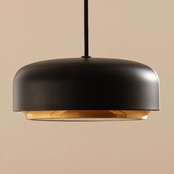 Die Hängelampe Hazel besteht aus mattschwarzem, gebürstetem Stahl mit einem glänzenden Messing-Abschluss, der dem Design einen modernen Ausdruck verleiht. Die Form ist von der bescheidenen Haselnuss inspiriert und die fest verbauten, warmweißen LEDs sind von einem weichen, weißen Diffusor abgedeckt. So scheint das Licht blendfrei und großflächig nach unten. Hazel ist in Kombination mit einem externen Dimmer in der Helligkeit einstellbar.