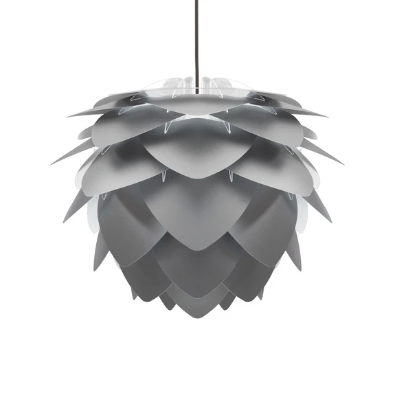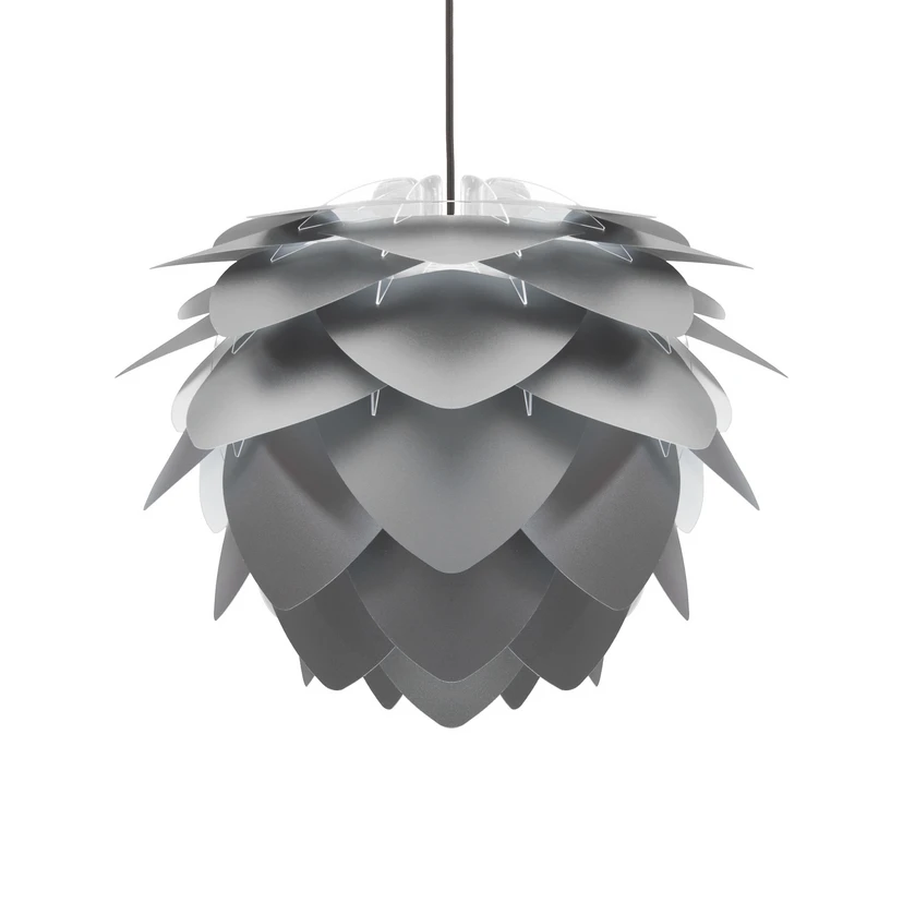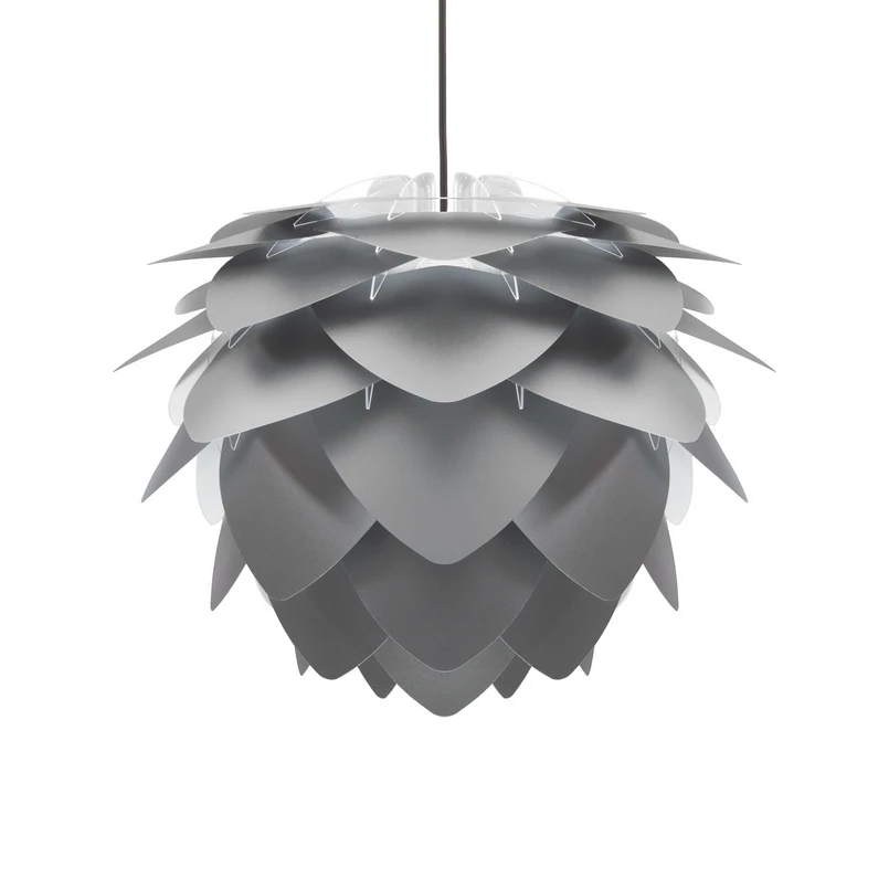 Optisch erinnert der Lampenschirm der Designer-Pendelleuchte Silvia an eine Artischocke. Ähnlich der Frucht besteht auch der Schirm aus vielen einzelnen Blättern. Diese Kunststoffplättchen werden einfach zusammengesteckt und bilden so die Grundlage der Leuchte. Da sie mit kleinem Abstand zueinander angeordnet sind, kann das Licht bequem durch die Blätter hindurch fallen. Auch nach oben und unten strahlt die Leuchte, sodass eine besondere Lichtwirkung geschaffen wird. Diese eignet sich hervorragend für Wohnzimmer oder Schlafzimmer. Aber auch als Tischbeleuchtung kann die Designer-Leuchte verwendet werden. Ein optischer Blickfang ist in jedem Falle garantiert.