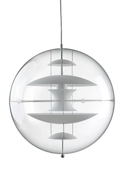 Die kugelförmigen Hängeleuchten der VP Globe sind alle nach einem ähnlichen Prinzip aufgebaut. Die äußere Hülle besteht aus einer transparenten Acrylkugel, die den Blick auf das Innenleben der Leuchte freigibt. Im Inneren der VP Globe Glass befinden sich verschieden große Glasreflektoren bzw. -diffusoren, die die Lenkung des Lichts beeinflussen. Sie sind so angeordnet, dass das Licht sowohl als Raumlicht zur Seite entweicht als auch sanft gestreut nach unten abgegeben wird, so dass die Hängeleuchte VP Globe Glass z. B. auch über einem Esstisch verwendet werden kann.